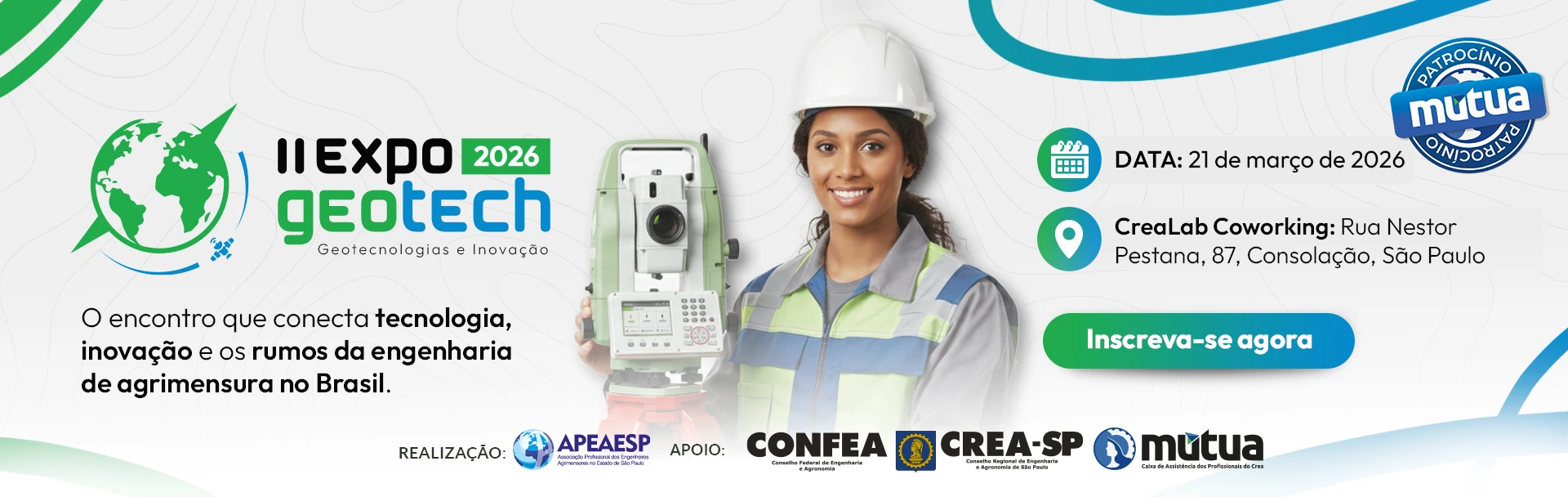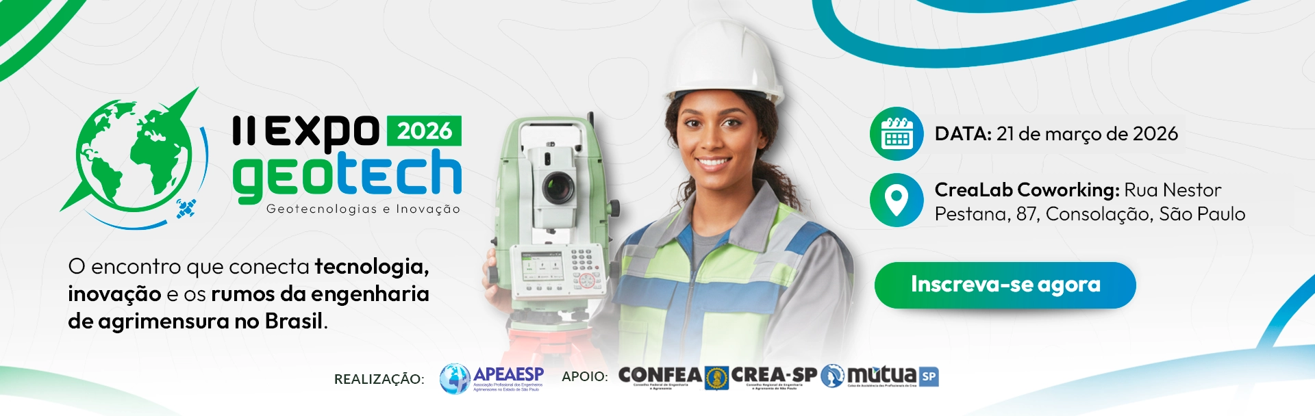 A APEAESP convida profissionais, estudantes e interessados na área para participar do Evento “II ExpoGeoTech 2026 –Geotecnologias e Inovação: Transformando a Engenharia de Agrimensura e Cartográfica no Brasil”.