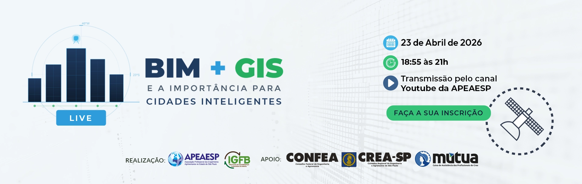 A APEAESP, em parceria com o IGFB e com apoio do CREA-SP e Mútua, convida você para participar de uma live técnica exclusiva sobre a integração entre BIM (Building Information Modeling) e GIS (Geographic Information Systems) e seu papel fundamental no desenvolvimento de Cidades Inteligentes.